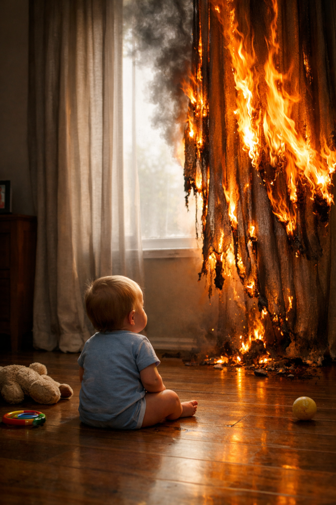 The curtain has caught fire in the baby’s room and the dog hears the baby crying, what will happen next?