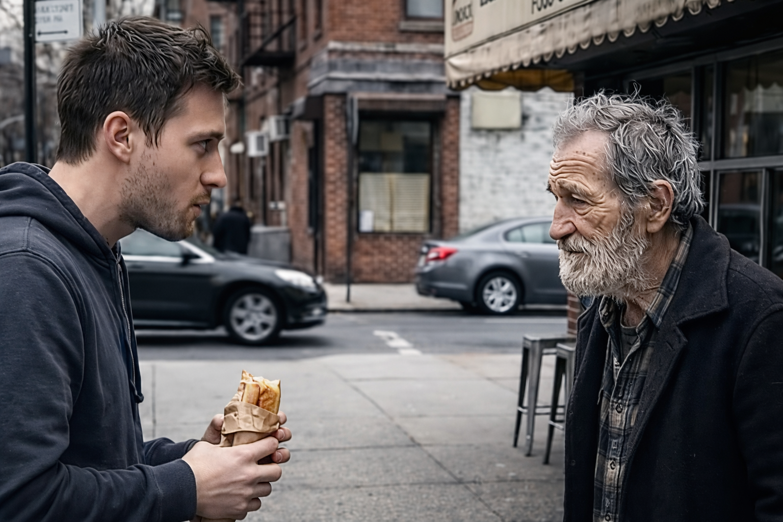 The Unexpected Encounter On a seemingly ordinary day, a young man purchased a meal to satisfy his hunger. As he exited the store, he was