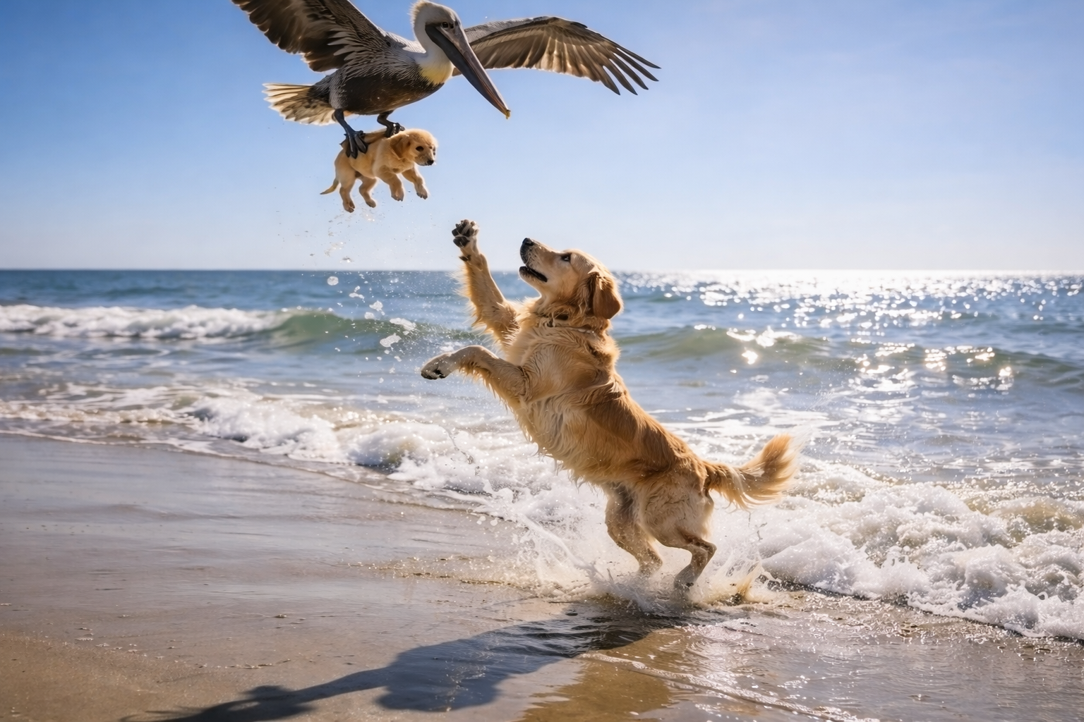The Unlikely Hero: A Pelican’s Interference In a rather extraordinary incident that took place at a local beach, a small puppy found itself in peril